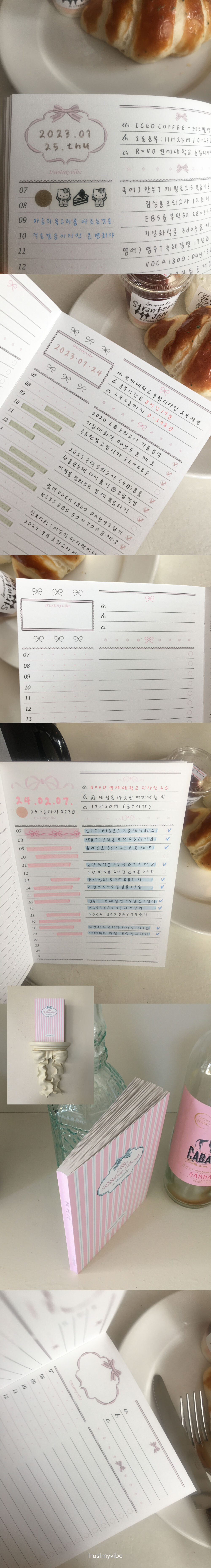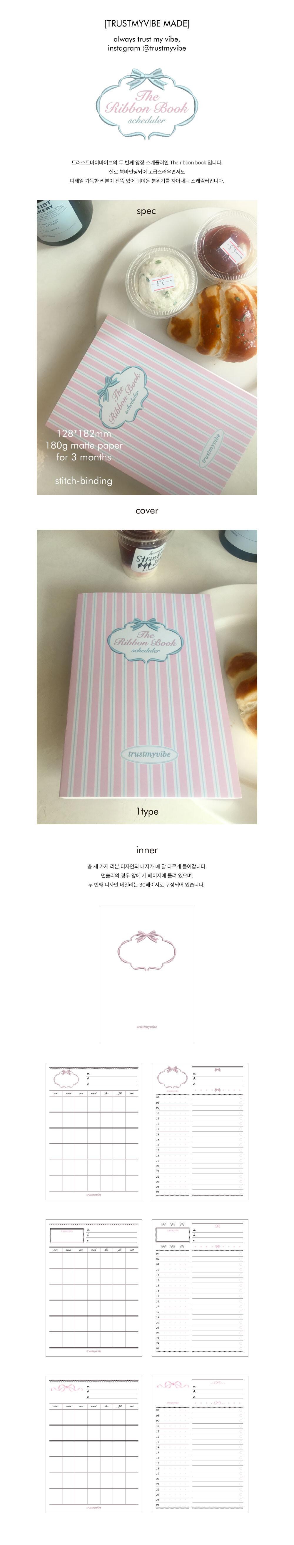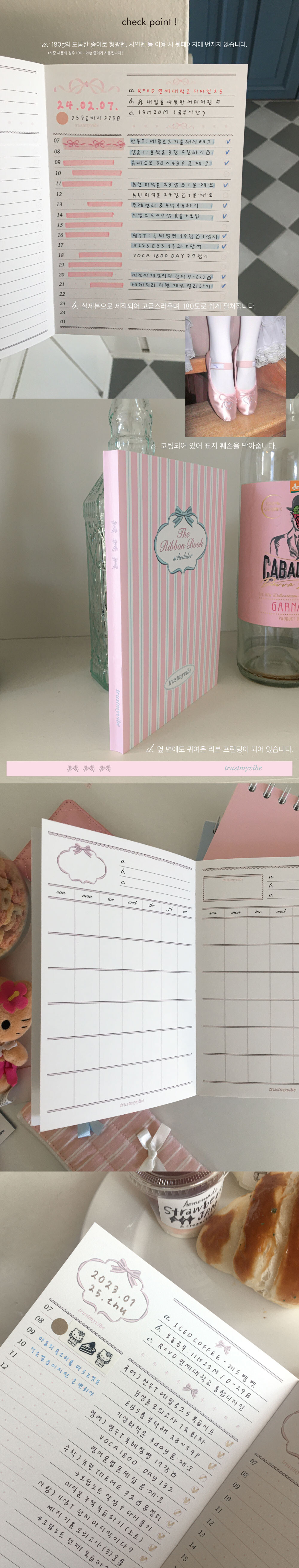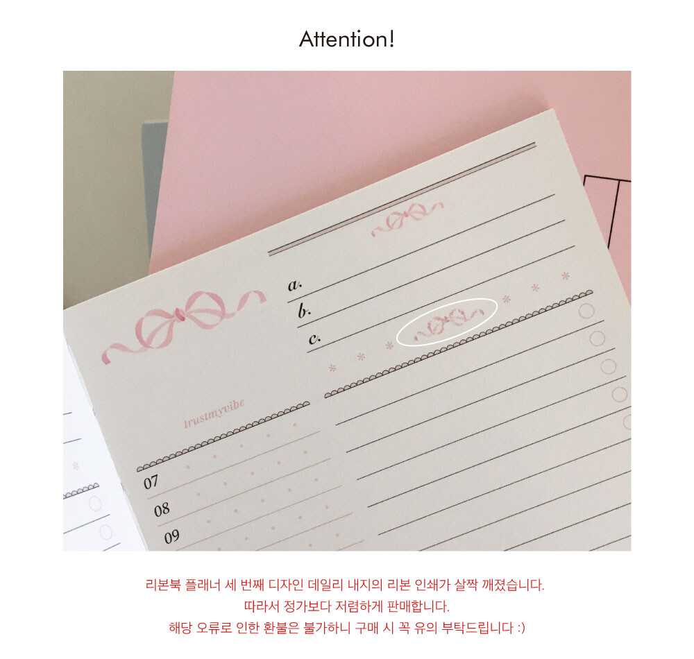 리본북 플래너 세 번째 디자인 데일리 내지의 리본 인쇄가 살짝 깨져, 정가보다 저렴하게 판매합니다. 해당 오류로 인한 환불은 불가하니 구매 시 꼭 유의 부탁드립니다 :)